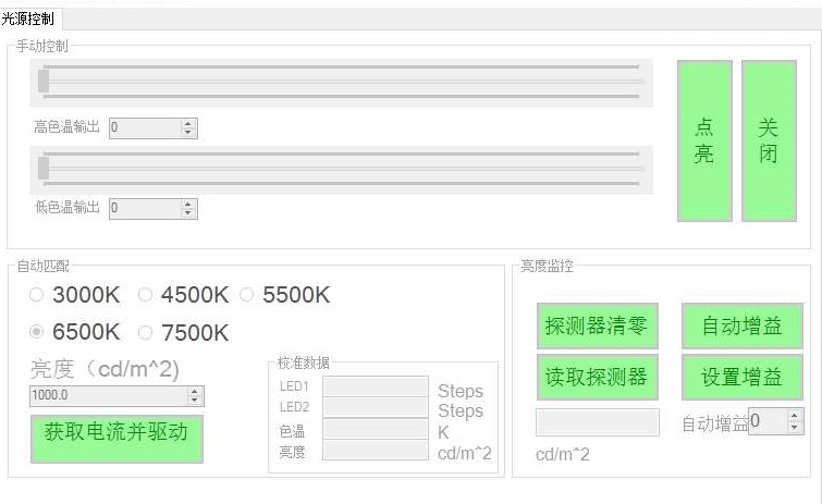 系統(tǒng)軟件界面如下圖。軟件界面比較直觀,可以手動(dòng)調(diào)節(jié) LED 的電流大小,在界面上就是光標(biāo)的位置,越往右代表電流越高,亮度越高。