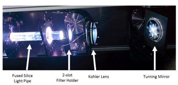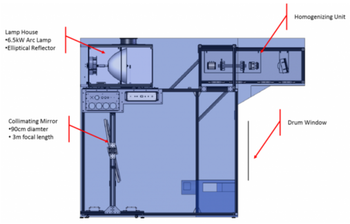 該系統(tǒng)的核心是6500 W氙氣短弧燈和深橢圓形反射鏡,可產(chǎn)生**的光功率并將其重定向到均質(zhì)系統(tǒng)中。使用定制的高度純化的熔融二氧化硅均質(zhì)棒來(lái)實(shí)現(xiàn)樣品鼓中所需的空間均勻性。均質(zhì)化的光被引導(dǎo)通過(guò)Koehler透鏡配置,被轉(zhuǎn)向鏡折回,然后再次被折回并被準(zhǔn)直鏡導(dǎo)入樣品鼓。其中一個(gè)焦距為3 m的近乎一米直徑的準(zhǔn)直鏡是由Sciencetech的一家鏡片供應(yīng)商專門生產(chǎn)的,并經(jīng)過(guò)Sciencetech的測(cè)試,以確認(rèn)達(dá)到了目標(biāo)輻照度。