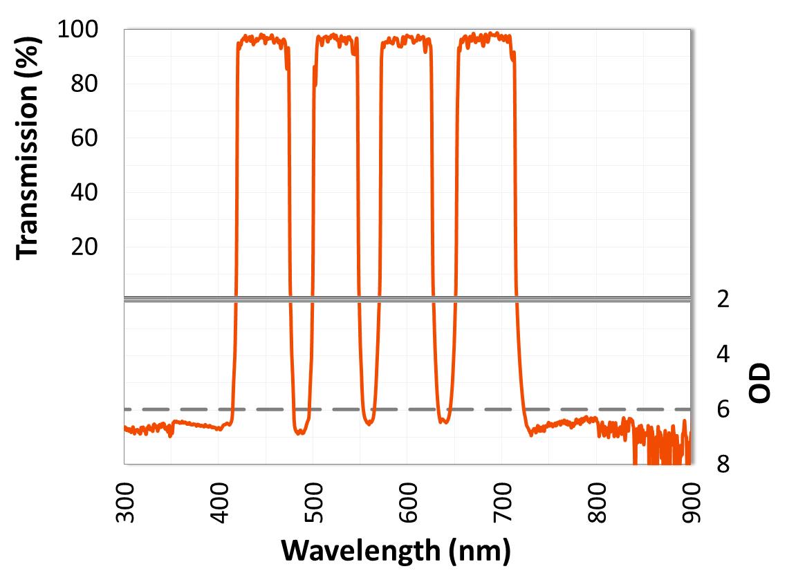 ULTRA系列多頻帶通濾光片可以設(shè)計(jì)為10個(gè)以上的透過波段,波段之間的OD值大于8,超高的截至陡度,高達(dá)98%的透過率。 它們非常適合用作熒光技術(shù)中的激發(fā)或發(fā)射濾光片,要求在單個(gè)樣本中同時(shí)檢測(cè)多個(gè)熒光團(tuán)。