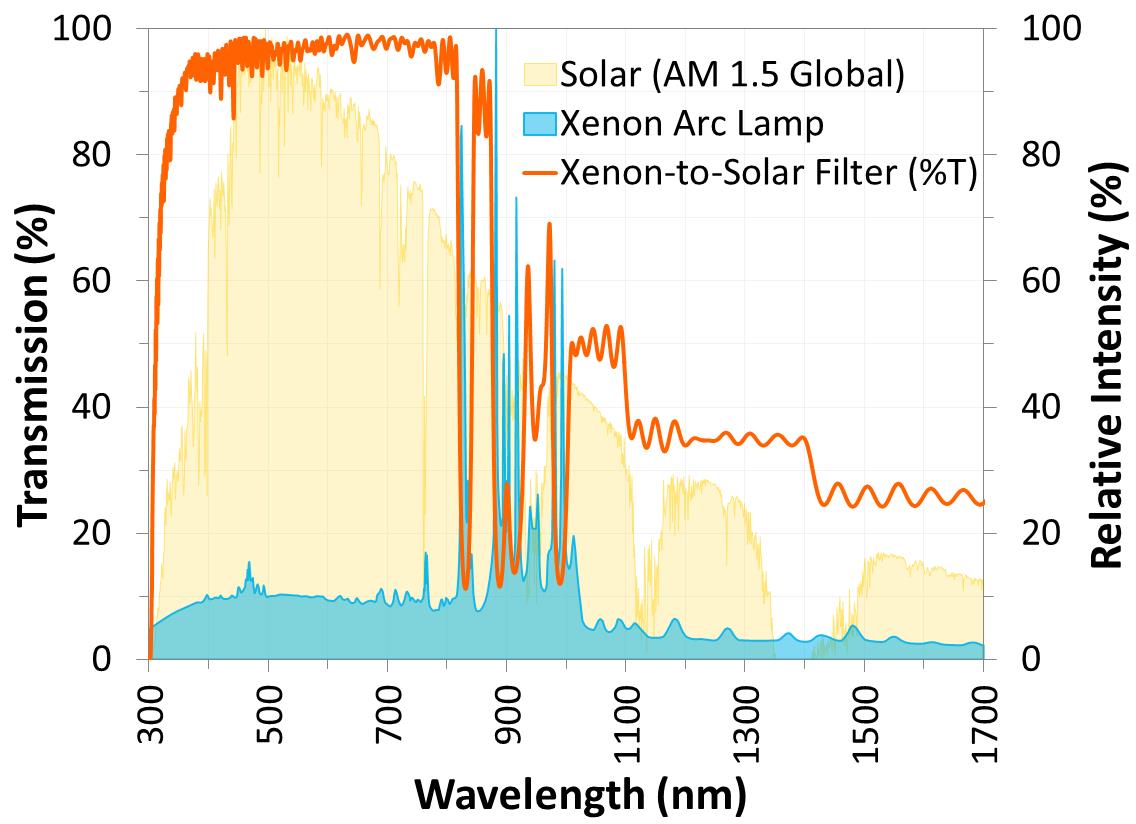 圖1.獨(dú)特的定制光學(xué)濾光片,旨在塑造氙弧燈的光譜,使其與太陽光相似。